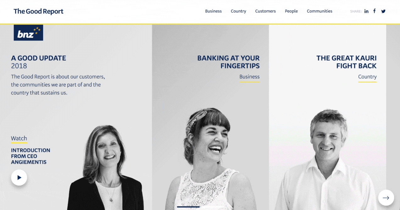 The Good Report is a platform for the BNZ bank's annual report. It's about customers, communities and our country. We designed the website to equally represent the different sections but with a focus on the Introduction from new CEO Angela Mentis.